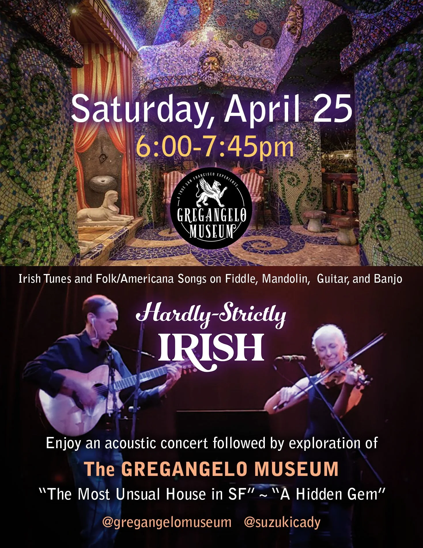 Don't miss this extraordinary "Only in San Francisco" immersive artistic experience! Enjoy an intimate HARDLY STRICTLY IRISH acoustic concert, followed by museum exploration at the hidden gem "most unusual…creative…magical…psychedelic house in San Francisco," The GREGANGELO MUSEUM!
