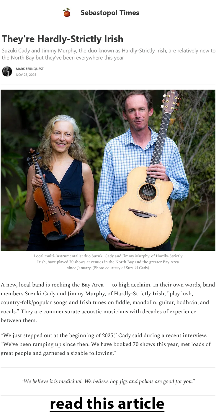PRESS Hardly-Strictly Irish EVENTS Subscribe to Live Music See our upcoming shows! Email Address Sign Up Privacy will be respected. Thank you! I’ll be in touch! CONTACT Suzuki Cadysuzukicady@gmail.com415-302-9658@suzukicady
